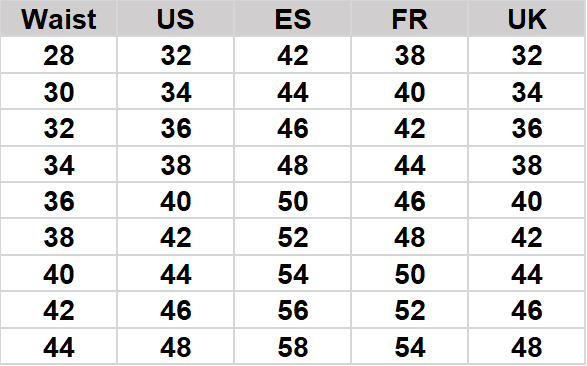 Size conversion chart for men's pants, showing waist sizes with corresponding US, ES, FR, and UK sizes.