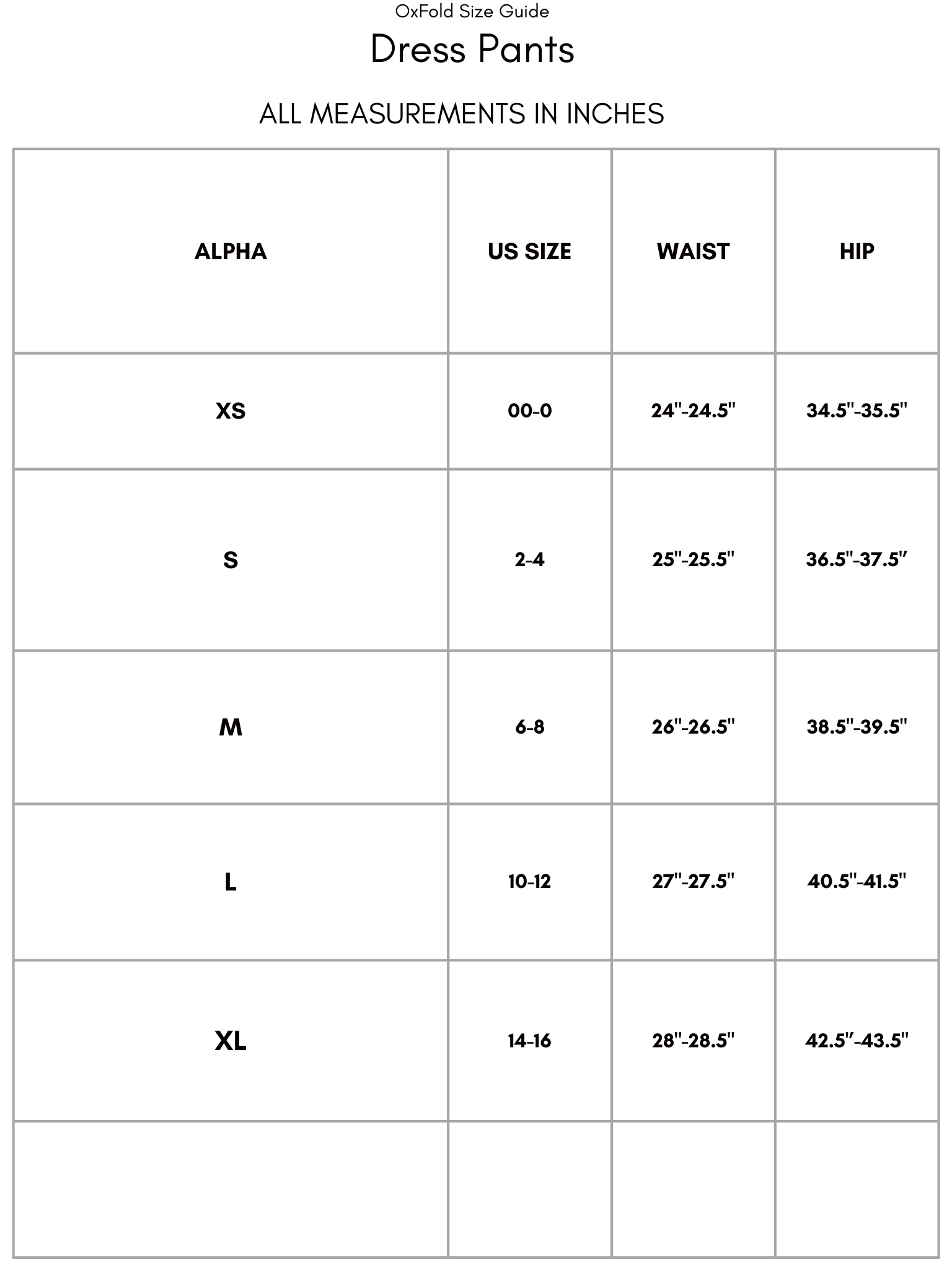 Size guide for dress pants by OxFold, detailing US sizes and measurements in inches for waist and hip across sizes XS to XL.