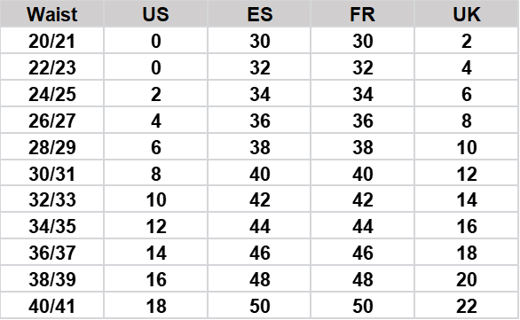 Size conversion chart for pants, showing waist measurements and corresponding sizes in US, Spain (ES), France (FR), and UK systems.