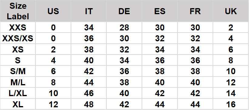 Clothing size conversion chart for women's sizes featuring columns for US, IT, DE, ES, FR, and UK markets. Sizes range from XXS to XL with corresponding numbers for each region. Example: XXS is US 0, IT 34, DE 28, ES 30, FR 30, UK 2.