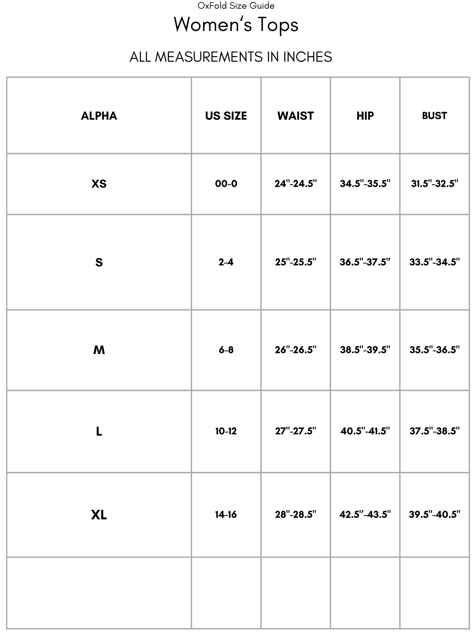 Women's tops size guide showing alpha sizes XS to XL with US sizes, waist, hip, and bust measurements in inches.